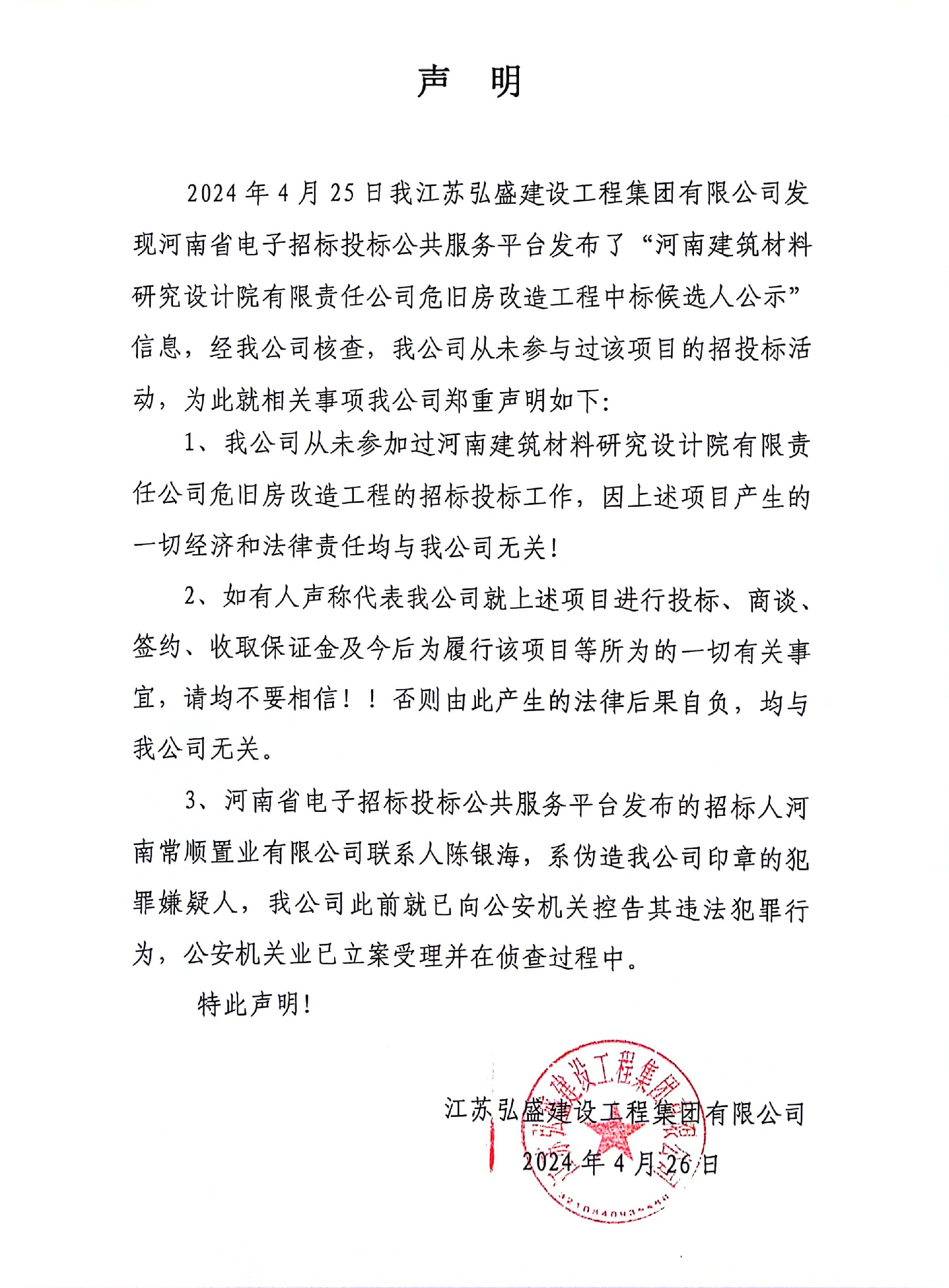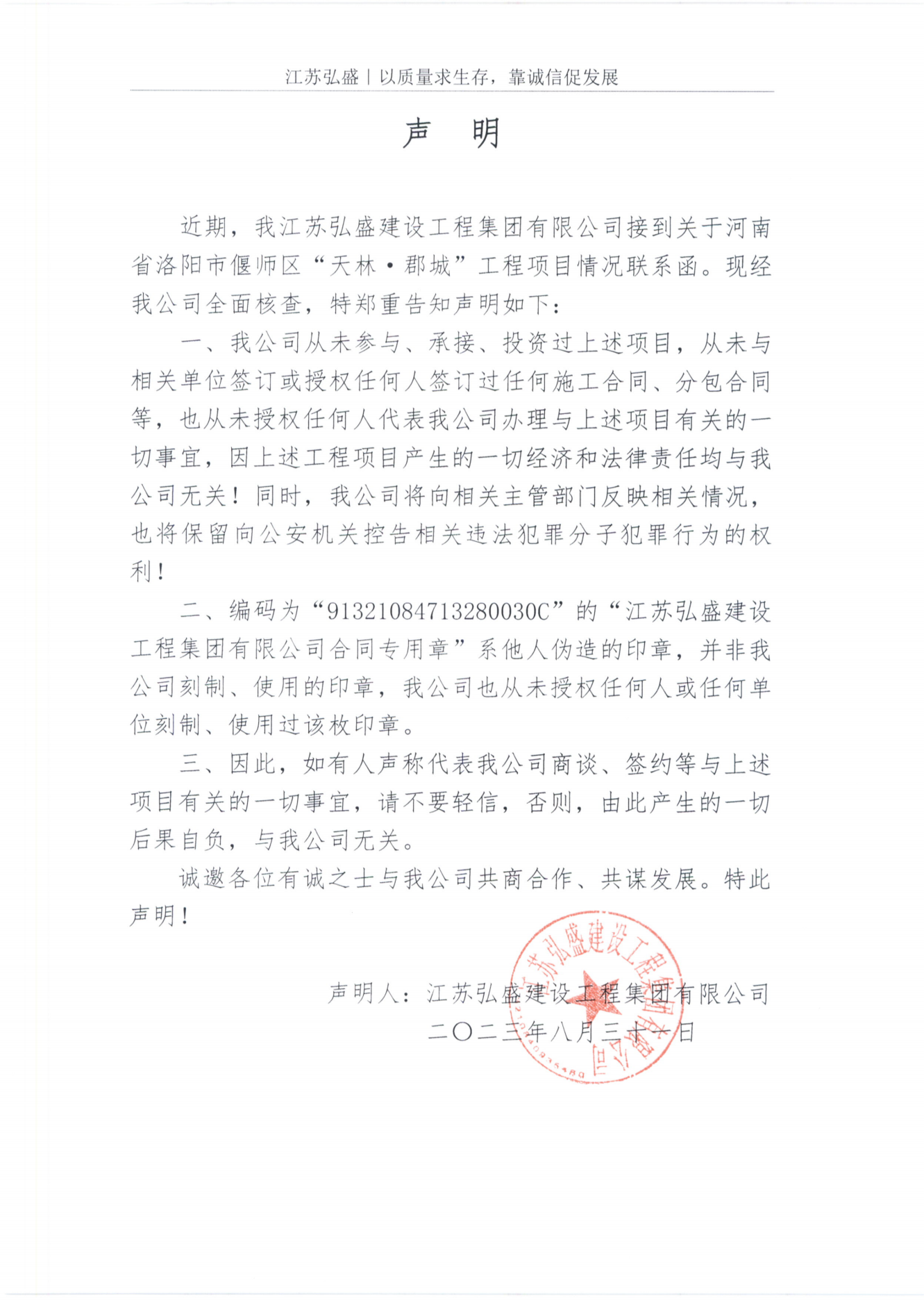近期,我江蘇弘盛建設工程集團有限公司接到關于河南省鶴壁市“鴻城凱歌北區(qū)”工程項目情況的咨詢?,F(xiàn)經我公司全面核查,特鄭重告知聲明如下:一、我公司從未參與、承接、投資過上述項目,從未與相關單位簽訂過任何施工合同、分包合同等,···