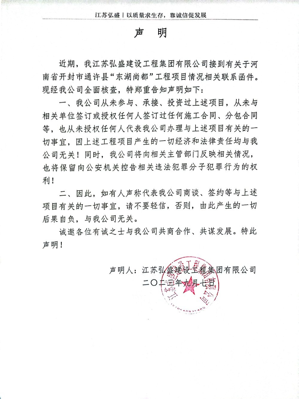 近期,我江蘇弘盛建設工程集團有限公司多次接到關于河南省許昌市鄢陵縣“桃源錦華府”、河南省新鄉(xiāng)市原陽縣橋北鄉(xiāng)“億港新城”工程項目情況的電話咨詢?,F(xiàn)經我公司全面核查,特鄭重告知聲明如下:一、我公司從未參與、承接、投資過上述項···