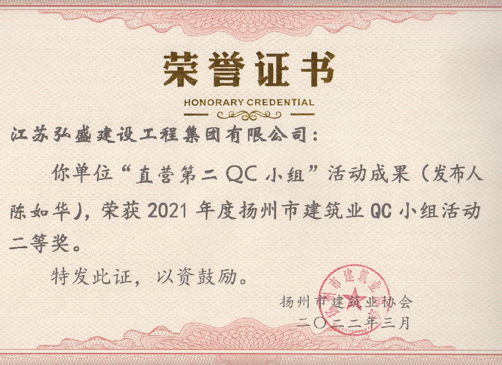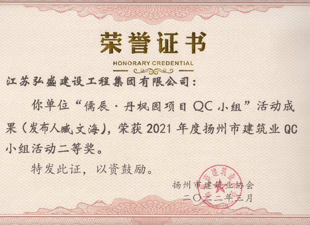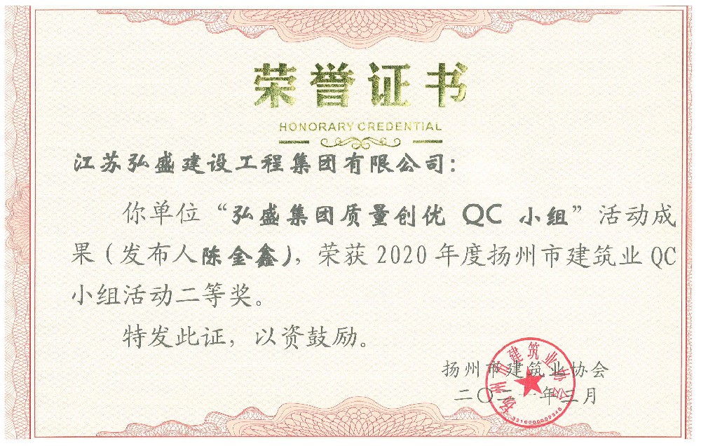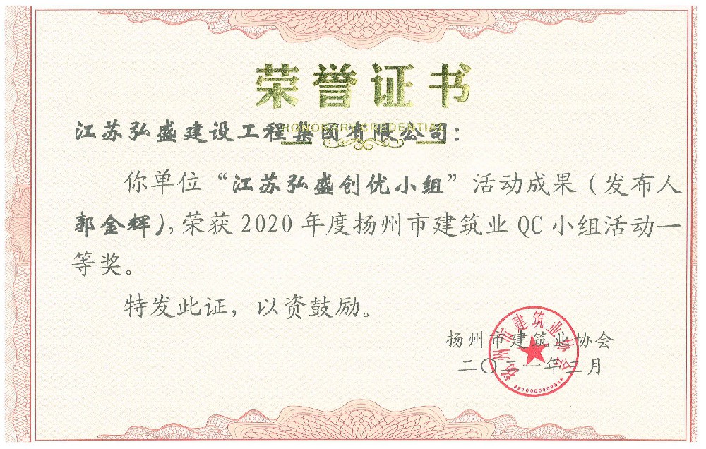 “江蘇弘盛集團(tuán)質(zhì)量創(chuàng)優(yōu)小組”榮獲2020年度揚州市建筑業(yè)QC小組活動一等獎